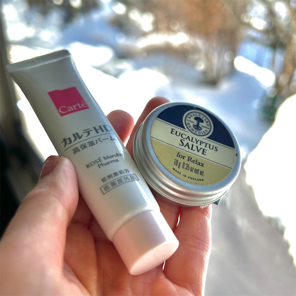 バーム系の濃い保湿アイテムが冬山では便利です。いつもよりも鼻をかんだり、温泉に入ってぽかぽかしたと思いきや寒気で乾燥したり、気づくとささくれができやすくなったり、乾燥肌の人はぜひぜひ。