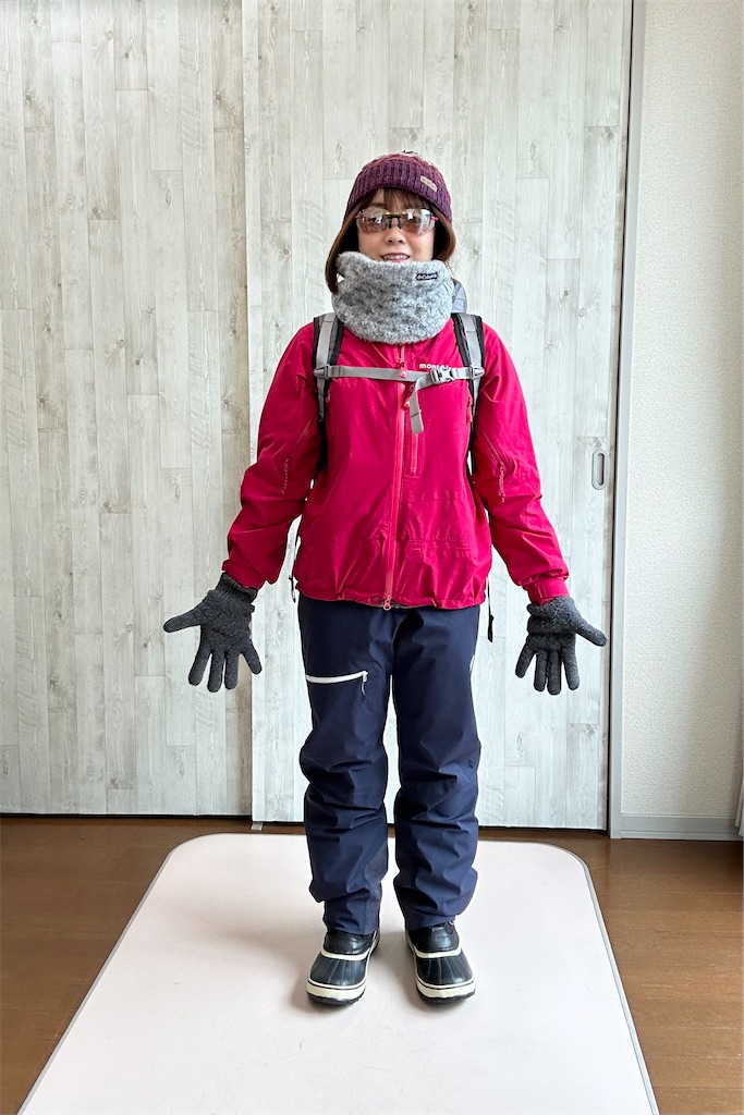 年末年始に行った時は基本的にこの感じで、外に出る時はダウンジャケット(分厚すぎない程度)とハードシェルを着ます。