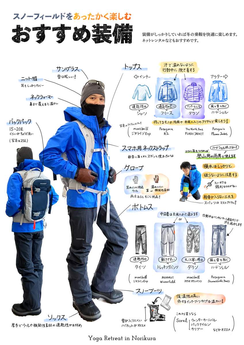 でも雪山なんて行ったことがない!という方に向けて、どんな用意が必要なのかポンチ絵的にまとめました。